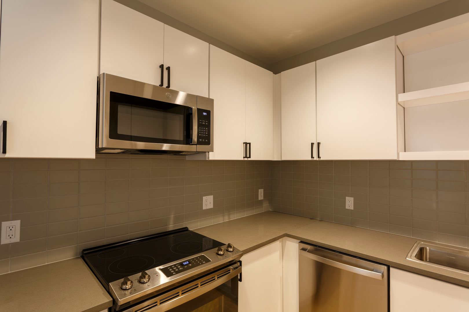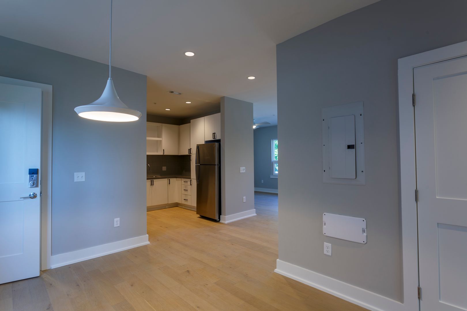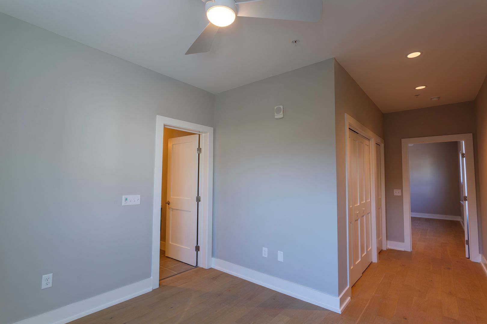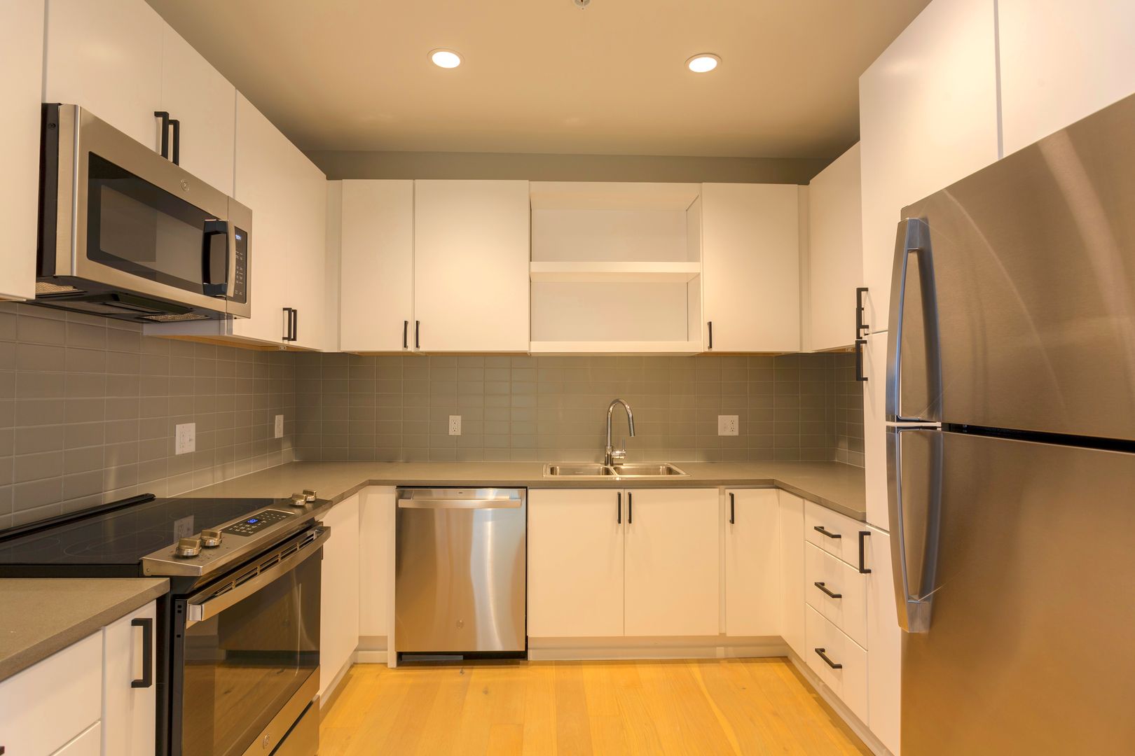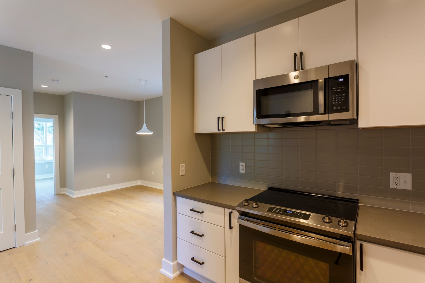 2 bedroom, 2 bath, brand new construction apartment available NOW! This 949 sqft unit offers an open floor plan complete with hardwood white oak floors throughout. Fully tiled bathrooms with quartz top vanity sinks. Kitchen is equipped with brand new Stainless Steel GE appliances, quartz countertops, tiled backsplash and modern cabinetry. Ceiling fans in living room and bedrooms! Laundry closet with washer/dryer in unit. Ample closet and storage space. Fully equipped fitness center on-site at no additional monthly fee. Building equipped with security features and a video intercom & access control system.