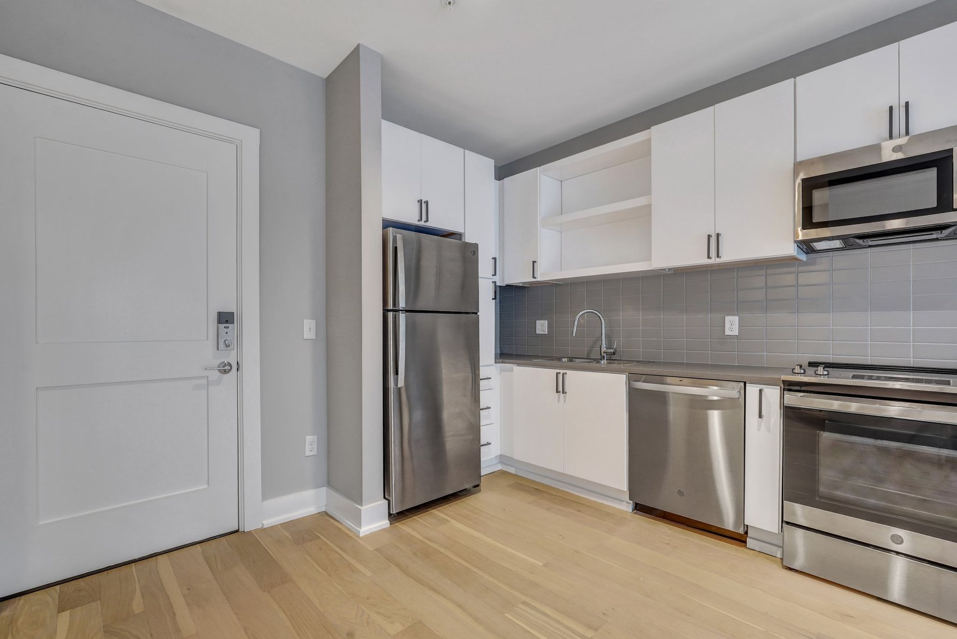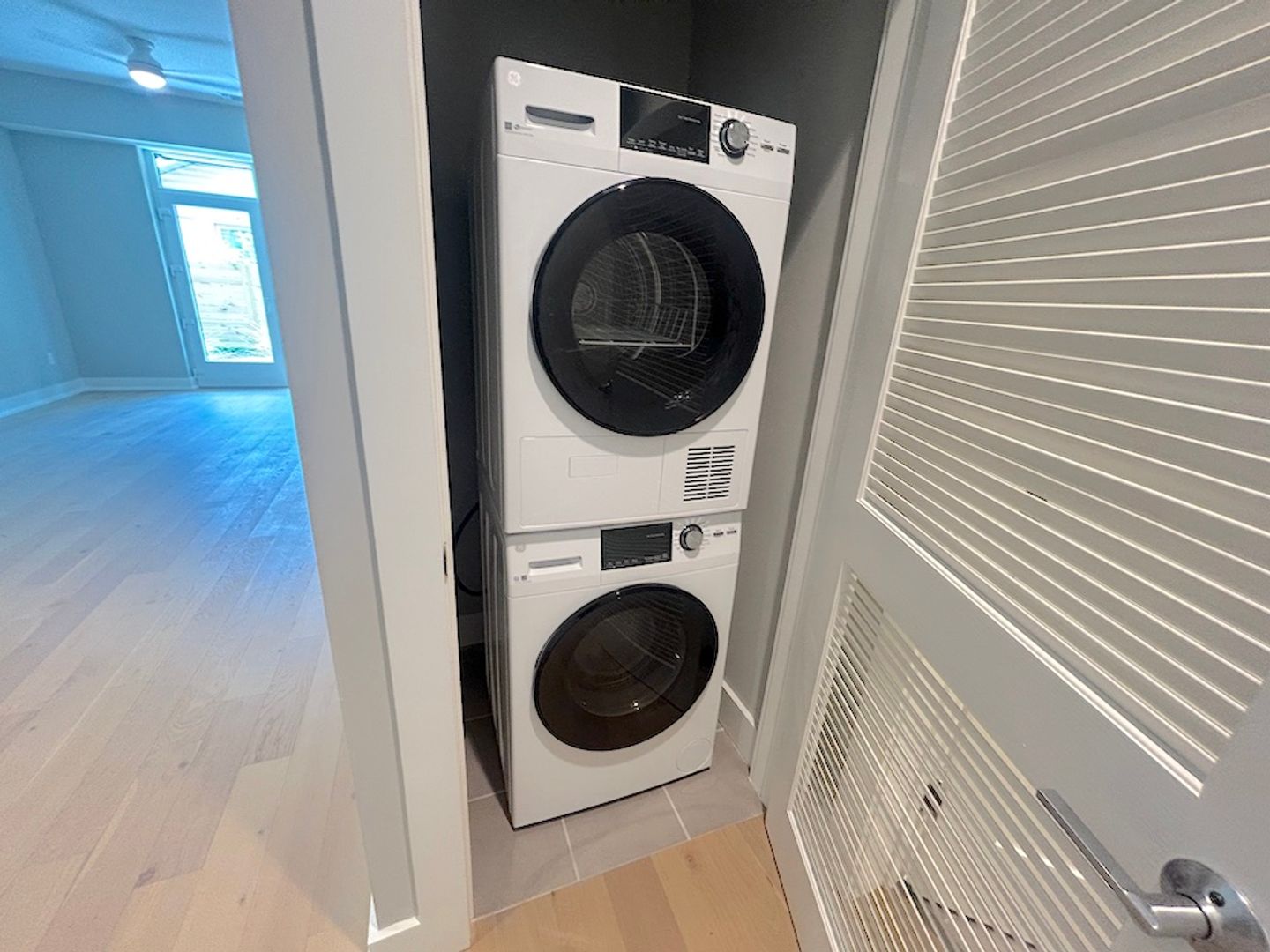 This 668 sqft unit offers an open floor plan complete with hardwood white oak floors throughout. Bathroom includes tile floor, quartz top vanity sink, and sleek 5-foot tiled shower with glass enclosure. Kitchen is equipped with brand new Stainless Steel GE appliances, quartz countertops, tiled backsplash and modern cabinetry. Ceiling fans in living room and bedroom! Laundry closet with washer/dryer in unit. Ample closet and storage space throughout. Fully equipped fitness center on-site at no additional monthly fee. Building equipped with security features and a video intercom & access control system.