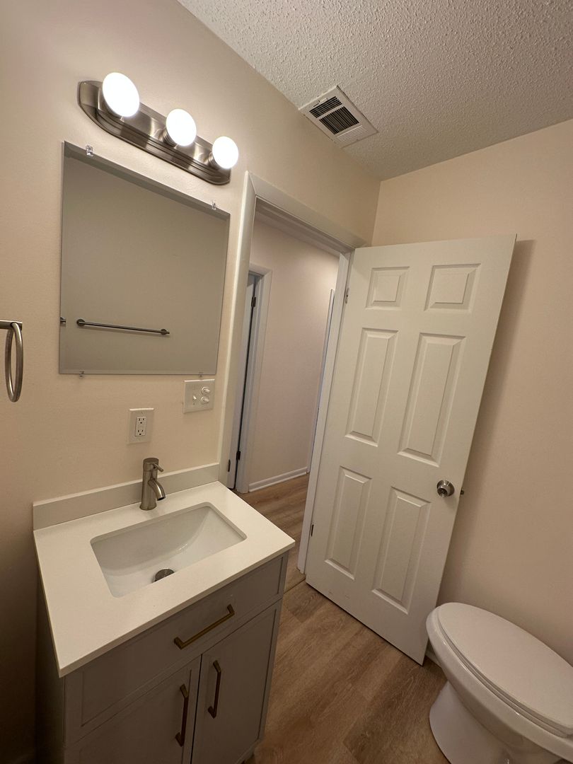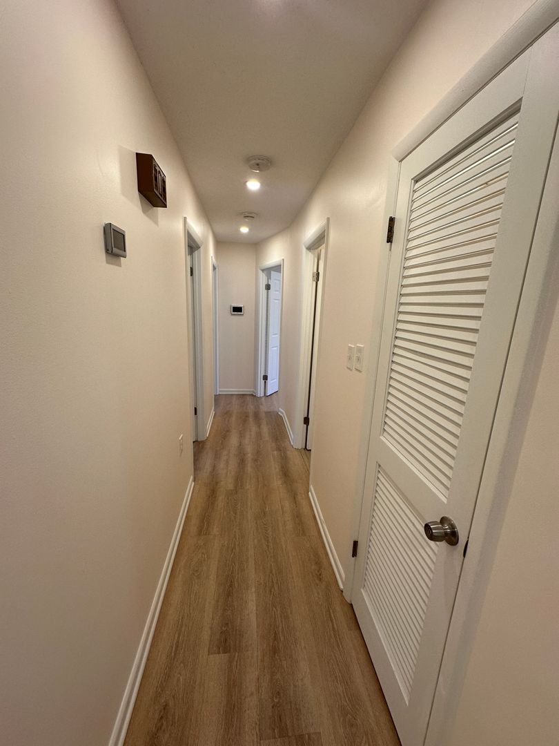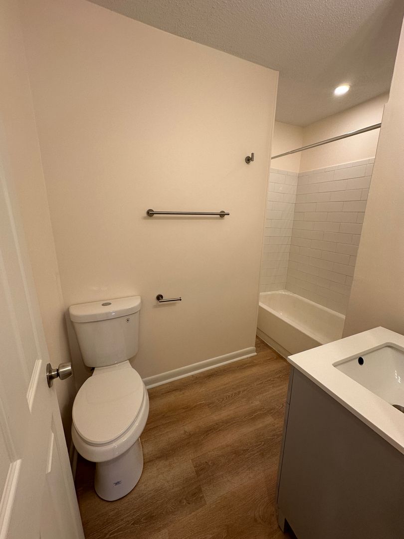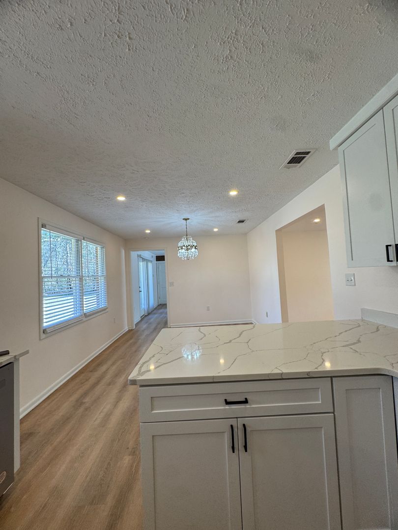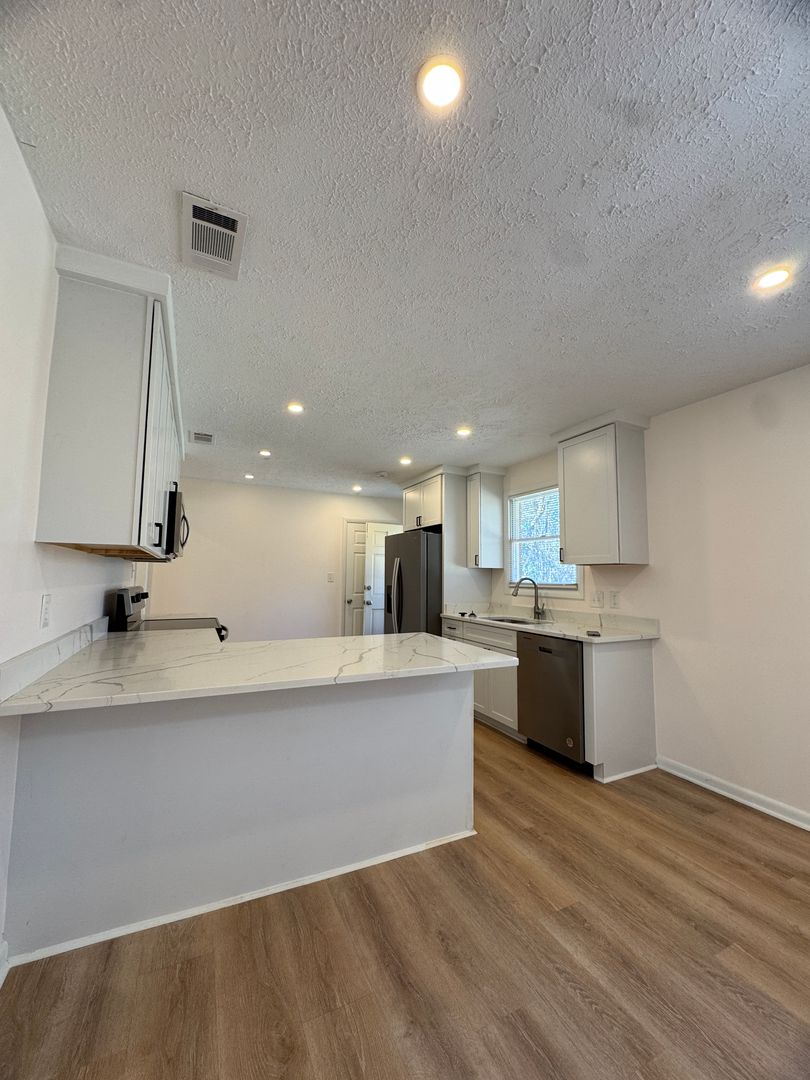 throughout. Kitchen features stainless steel appliances, modern white shaker style cabinets, white quartz countertops, and breakfast bar seating. Primary bedroom complete with en-suite bathroom.